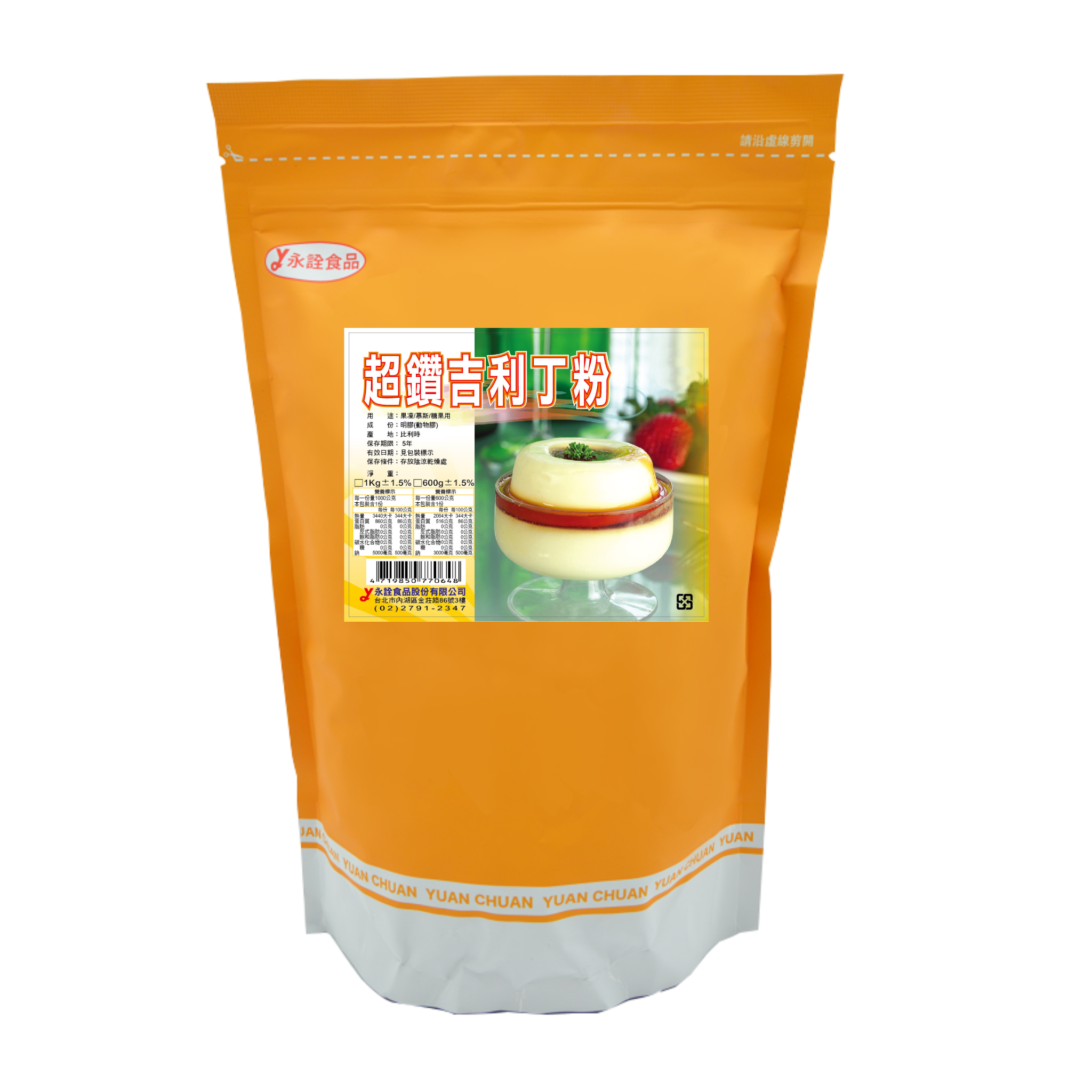 使用例: 1.每100g的慕斯餡或果凍液約使用超鑽吉利丁粉2.5g 2.將超鑽吉利丁粉倒入約3~5倍的冰水中膨潤,不要攪拌,使其吸水膨脹,再間接加熱溶解(配方中要扣除泡開吉利丁粉的水量),然後再加入產品中拌勻、裝模、冷卻、定型